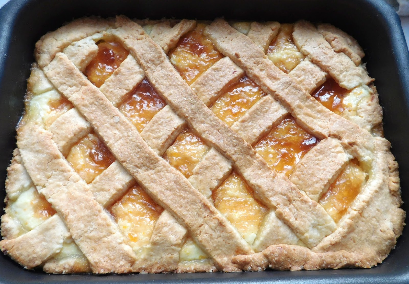 Раскатать 2/3 теста пластом на дно формы сформировав бортик в 1-1,5 см. Выложить творожную начинку, разровнять. Намазать варенье (у меня абрикосовое) 4-5 ст.ложек. Оставшемся тестом оформить верхний слой.